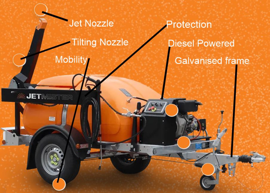 JetMister is easy to locate, position and operate quickly with its own power supply for pressurised misting. The auto swing nozzle means you can attack the dust in remote locations very economically. Its 1000L clean water tank capacity will provide constant dust suppression for up to 30-70 mins.